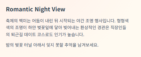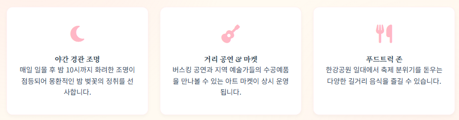 - 야간 경관 조명 점등: 매일 일몰 후부터 밤 10시까지 벚꽃길을 따라 화려한 조명이 켜집니다. 낮과는 또 다른 몽환적인 밤 벚꽃의 정취를 느낄 수 있어 직장인들의 퇴근길 데이트 코스로도 인기가 높습니다.