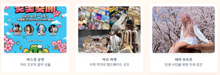 - 거리 공연 및 아트 마켓: 축제장 곳곳에서 버스킹 공연이 펼쳐지며, 지역 예술가들의 수공예품을 만나볼 수 있는 아트 마켓과 다양한 음식을 즐길 수 있는 푸드트럭 존이 운영됩니다.