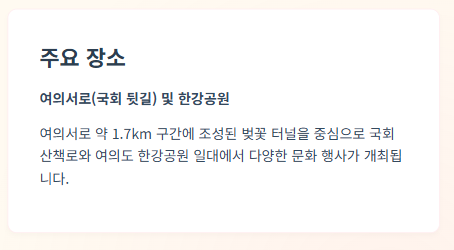 - 주된 장소: 여의서로(국회 뒷길) 약 1.7km 구간 및 여의도 한강공원 일대에서 열립니다.