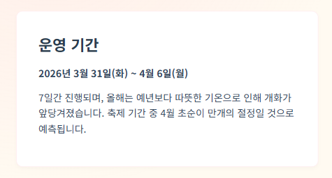 - 축제 기간: 2026년 3월 31일(화)부터 4월 6일(월)까지 7일간 진행됩니다.