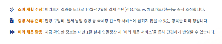 미리보기 서비스는 단순히 예상 세액을 확인하는 것을 넘어, 남은 기간의 소비 계획까지 조정할 수 있는 전략적 도구입니다.