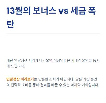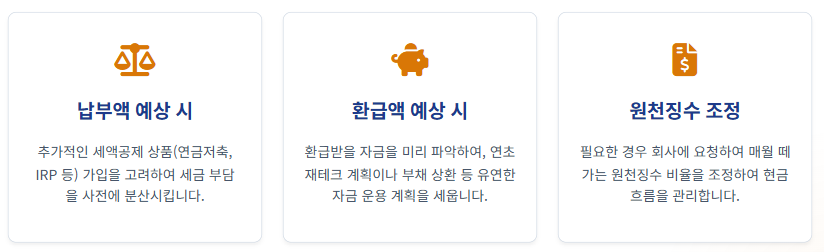 - 예상 납부액이 높게 나올 경우, 연말정산 전까지 원천징수액을 조정하거나 *추가적인 세액공제 상품(연금저축 등)*에 가입하여 세금 부담을 사전에 분산할 수 있습니다.