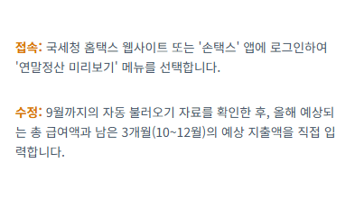 - 연말정산 미리보기는 1월부터 9월까지의 실제 지출액과 예상 연간 급여를 바탕으로 시뮬레이션을 제공합니다.