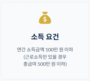 | 금융소득 | 이자/배당 소득 합계 2,000만 원 이하 | 분리과세되어 소득 요건 충족으로 간주 |