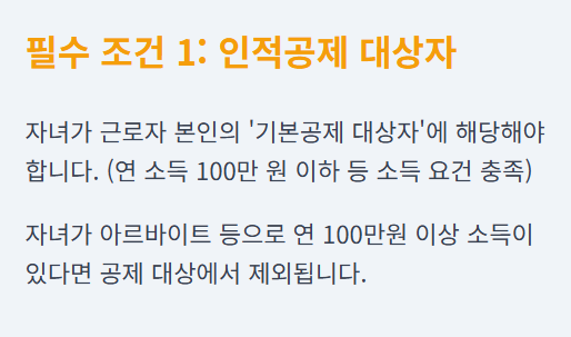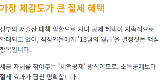 - 전략: 맞벌이 부부라면 인적공제를 받는 사람이 자녀세액공제도 함께 받도록 설정하세요.
