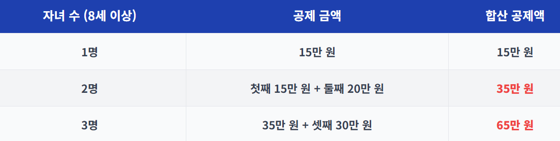 자녀 수에 따른 공제 금액은 다음과 같습니다.