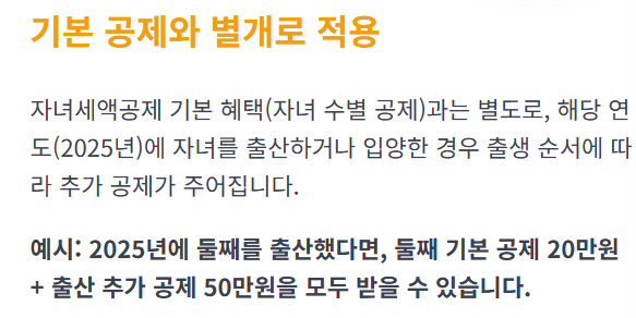 만약 2025년에 둘째 아이를 출산했다면, 자녀세액공제 기본 혜택(둘째 20만 원)에 더해 출산 추가 공제 50만 원까지 받아 총 70만 원의 세금을 감면받을 수 있습니다.