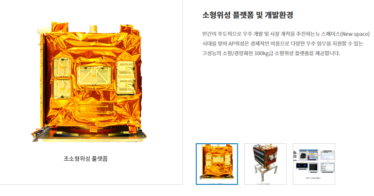 민간이 주도적으로 우주 개발 및 시장 발전을 추진하는 뉴 스페이스 시대를 맞아 AP위성은 경제적인 비용으로 다양한 우주 임무를 지원할 수 있는 고성능의 소형/경량화된 100kg급 소형위성 플랫폼을 제공한다. AP위성은 2단계 한국형 발사체의 성능을 검증하기 위하여 소형위성 개발 사업을 통하여 100kg급 소형위성 플랫폼과 비행소프트웨어개발을 지원하는 개발환경을 개발했다. AP위성의 소형위성 플랫폼의 특징으로 위성의 소형/경량화 부분에서 플랫폼 구성품의 소형/경량화 및 단순화를 시켰으며, 경제적 시스템은 COTS 및 Open source 기반 설계 적용을 하였고 소형위성의 고성능화: 고성능 중앙집중직 탑재컴퓨터 및 정밀 자세제어가 탑재되었다.