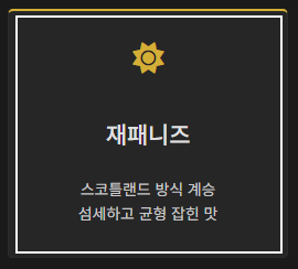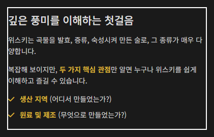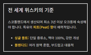 | 아이리시 위스키 (Irish) | 아일랜드에서 3회 증류하여 매우 부드러운 목 넘김이 특징입니다. 피트향은 거의 사용하지 않습니다. |