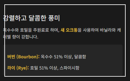 - 특징: 옥수수, 호밀 등 다양한 곡물을 사용하며, 새 오크통(New Oak Barrel)에 숙성시켜 강하고 달콤한 풍미를 냅니다.