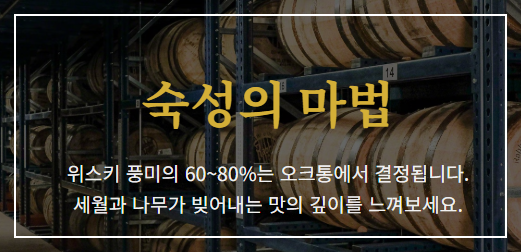 위스키의 색상과 풍미의 60~80%는 숙성 통에서 결정됩니다.
