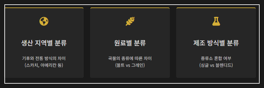 위스키는 곡물을 발효, 증류, 숙성시켜 만든 증류주로, 원료와 생산지에 따라 그 종류와 풍미가 매우 다양합니다. 위스키의 복잡한 종류를 이해하는 것은 위스키의 깊은 매력을 느끼는 첫걸음입니다. 위스키는 크게 '생산 지역'과 '원료 및 숙성 방법이라는 두 가지 핵심 관점으로 분류할 수 있습니다.