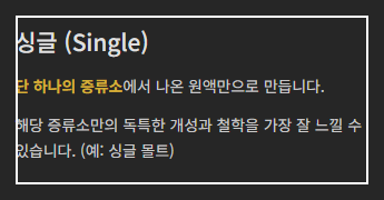 - 예시: 싱글 몰트 스카치 위스키 (하나의 증류소 + 맥아 100%)