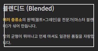 - 예시: 싱글 몰트 스카치 위스키 (하나의 증류소 + 맥아 100%)