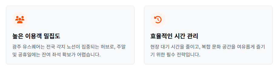 앱 실행 후 출발지를 광주(유스퀘어)로 설정하고 목적지와 날짜를 선택하면 실시간 좌석 현황을 확인할 수 있습니다. 시외버스 노선의 경우에는 '버스타고' 앱이나 '티머니GO' 내 시외버스 메뉴를 통해 예매가 가능합니다. 결제까지 완료하면 QR코드 형태의 전자 승차권이 발행되며, 이를 버스 탑승 시 단말기에 인식시키면 됩니다.