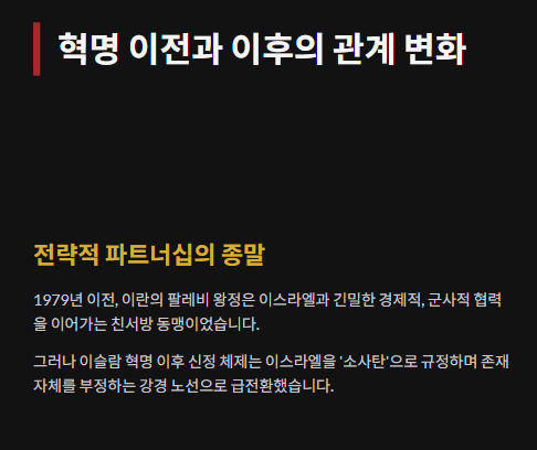 - 이념적 배경: 1979년 이슬람 혁명 이후 이란이 이스라엘을 주적으로 규정하며 관계가 단절됨.