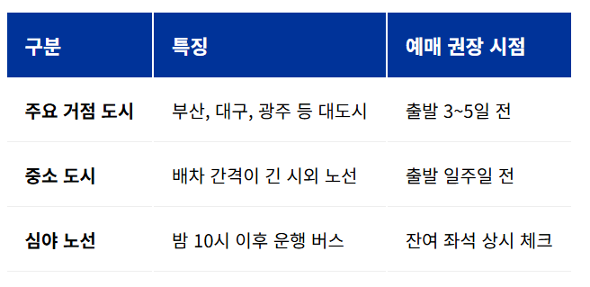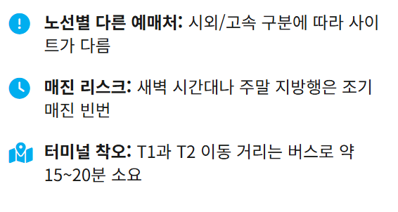 - 시외버스 통합예매: 대부분의 지방행 버스는 시외버스 티머니 또는 버스타고 사이트에서 예매할 수 있습니다.