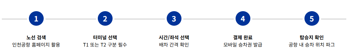 - 터미널 구분: 인천공항은 제1여객터미널(T1)과 제2여객터미널(T2)이 분리되어 있습니다. 본인이 이용하는 항공사가 어느 터미널인지 반드시 확인 후 목적지를 설정하세요.