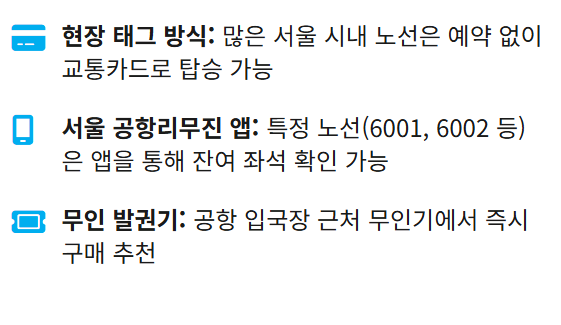 - 현장 결제 노선: 일부 서울/수도권 공항 리무진 노선은 온라인 예매가 도입되어 있지 않습니다. 이 경우 정류장에서 교통카드(티머니, 후불 교통카드)를 직접 태그하거나 현장 무인발권기를 이용해야 합니다.