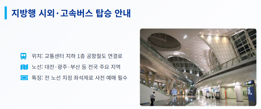• 탑승 방법: 여객터미널에서 교통센터 방향으로 이동한 후 지하로 내려가시면 목적지별 승강장 번호를 쉽게 확인하실 수 있습니다.