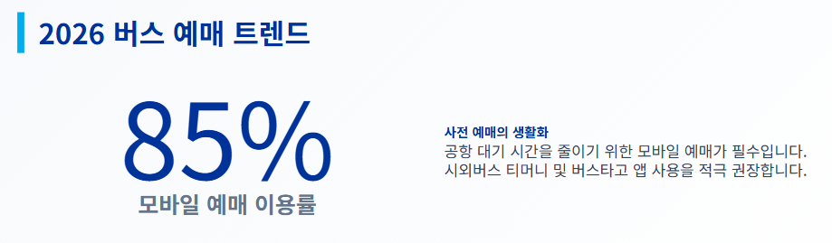주의사항: 2026년 현재 많은 노선이 예약제로 운영되므로, 현장 발권보다는 시외버스 티머니나 버스타고 앱을 통해 미리 예매하시는 것이 좌석 확보에 유리합니다.