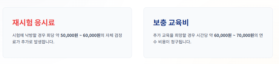 한 번에 합격한다면 추가 지출이 없겠지만, 만약 시험에서 떨어질 경우 재시험 응시료와 보충 교육비가 발생합니다. 2026년 기준 전문학원의 재시험 응시료는 회당 약 5만 원에서 6만 원 수준입니다.