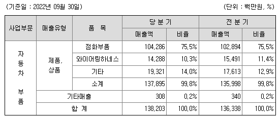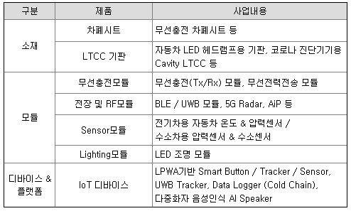 무선충전 차폐시트, 자동차 전장 모듈, Lighting 모듈 및 IoT Device 등 소재와 모듈 부문으로 구성된 소재부품 전문기업으로 2008년 11월에 설립되었다. 사업영역 중 현재 매출 비중이 큰 주요 제품은 소재부분의 무선충전 차폐시트, 모듈 부문의 무선 충전 모듈, RF모듈 중 5G 관련 모듈, 센서모듈중 전기차, 수소차 관련 모듈 등은 현재 개발이 완료되어 초도 매출이 일어나거나 고객승인이 진행 중인 제품으로 전방시장이 크고 당사가 기술 경쟁력 및 제품 경쟁력을 보유하고있다.