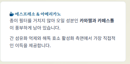 • 에스프레소 vs 드립 커피: - 에스프레소(아메리카노): 종이 필터를 거치지 않아 간 보호 성분인 카와웰과 카페스톨이 풍부하게 남아있습니다. 간 질환 예방 측면에서는 에스프레소 기반의 커피가 유리할 수 있습니다.