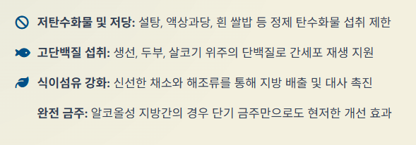 - 금주: 알코올성 지방간의 경우 술을 끊는 것만으로도 수주 내에 간 수치가 정상화될 수 있습니다.
