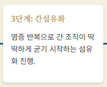 - 2단계 지방간염(NASH): 지방 축적과 함께 간세포에 염증이 생긴 상태입니다. 이때부터 간 손상이 본격적으로 시작됩니다.