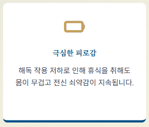 - 심한 피로감과 전신 쇠약감: 간 기능이 저하되면서 에너지 대사와 해독 작용이 원활하지 않아 휴식을 취해도 몸이 무겁게 느껴집니다.