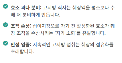 • 췌장액의 분비 압박: 지방 함량이 높은 음식을 먹으면 췌장은 이를 분해하기 위해 강력한 소화 효소를 다량 내보내야 합니다. 이 과정에서 췌장 조직이 스스로 손상되는 자가 소화 현상이 일어날 수 있습니다.