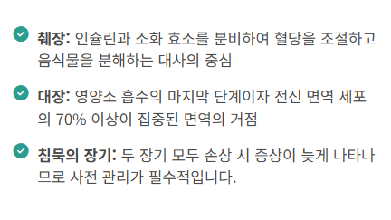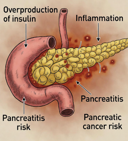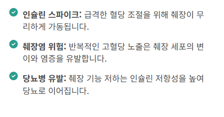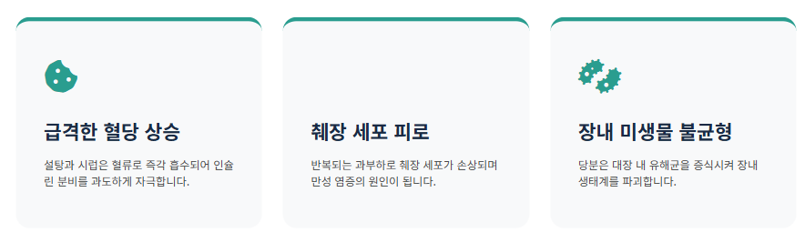 • 췌장 가중 과부하: 단순당은 혈당을 급격히 올립니다. 이를 조절하기 위해 췌장은 인슐린을 과다 분비하게 되며, 이 과정이 반복되면 췌장 세포가 지치고 염증이 생겨 췌장염이나 췌장암의 위험이 높아집니다.