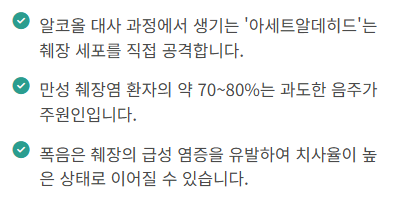 • 췌장 세포 파괴: 알코올은 췌장액을 끈적하게 만들어 분비 통로를 막고, 췌장 세포 내에 직접적인 독성 반응을 일으켜 만성 췌장염의 제1 원인이 됩니다.