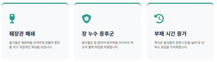 • 대장 면역 체계 붕괴: 과도한 알코올은 장 점막의 투과성을 높여 독소가 혈액으로 바로 침투하게 만드는 '장 누수 증후군'을 유발합니다. 또한 폭식은 대장에 머무는 음식물의 부패 시간을 늘려 대장 건강을 악화시킵니다.