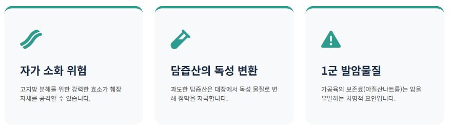 • 대장 점막 자극: 지방 소화를 위해 분비된 담즙산이 대장으로 내려가면, 대장 내 세균에 의해 독성 물질로 변해 대장 점막을 자극하고 세포 변이를 일으킵니다. 가공육의 아질산나트륨 등 보존료는 세계보건기구(WHO)가 지정한 1군 발암물질이기도 합니다.