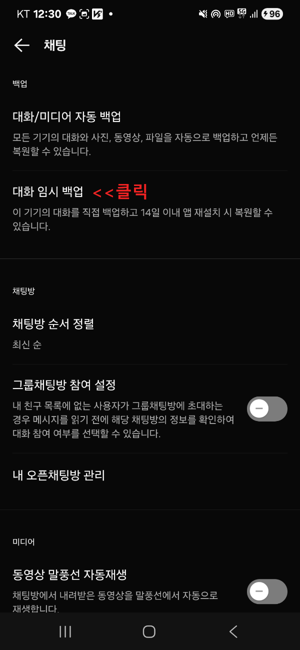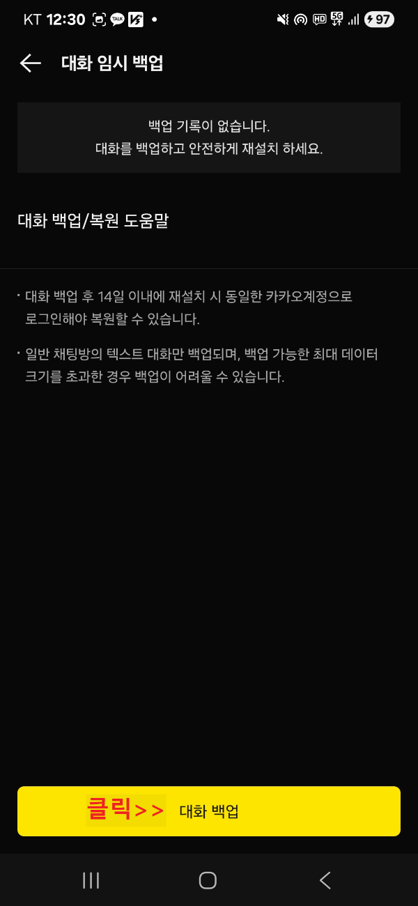 대화 임시 백업을 클릭! 여기에서 주의하실점은 14일기간 이내만 백업이 가능하니 꼭 14일은 넘기지 마세요 ^^