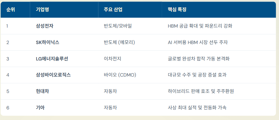 | 1 | 삼성전자 | 반도체, 스마트폰 | 압도적 1위, HBM 공급 확대 및 파운드리 경쟁력 강화 |