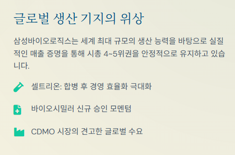 | 4 | 삼성바이오로직스 | 바이오 (CDMO) | 대규모 수주 계약 및 공장 증설을 통한 견고한 성장 |