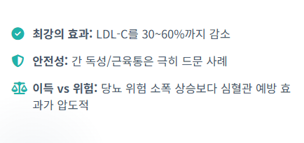 스타틴은 LDL-C를 30~60%까지 낮추는 가장 안전하고 효과적인 1차 치료제입니다. 약물에 대한 막연한 공포보다는 실제 이득을 따져봐야 합니다.