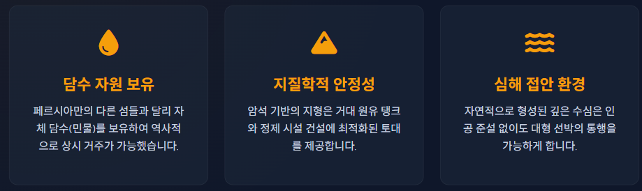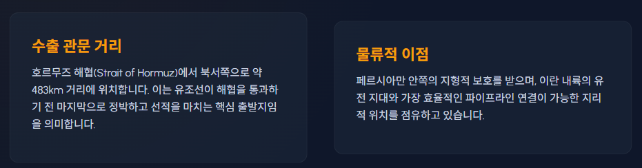 - 전략적 좌표: 호르무즈 해협(Strait of Hormuz)에서 북서쪽으로 약 483km 떨어져 있으며, 페르시아만 안쪽에 깊숙이 자리 잡고 있어 원유 선적에 최적화된 장소입니다.