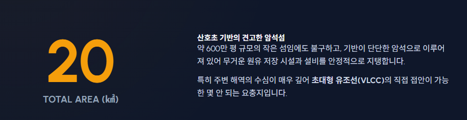 - 면적: 약 20㎢(약 600만 평) 규모의 작은 산호초 섬입니다. 크기는 작지만 기반이 암석으로 되어 있어 거대 유조선이 접안할 수 있는 깊은 수심을 제공합니다.