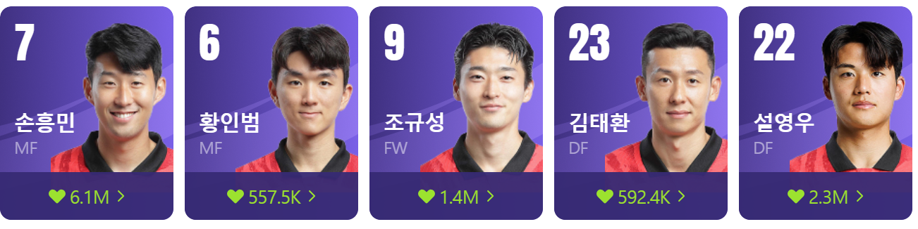 현재 김승규키퍼가 부상으로 조현우선수가 발을 맞추며 열심히 뛰고 있지만 아쉬운 성적은 어쩔 수 없네요. 공격수는 조규성, 오현규선수가 라인에 들어오고, 미드는 손흥민, 이강인, 정우영, 이재성, 황인범선수가 선발 가능성이 크네요. 수비는 김민재, 김영권, 김진수선수가 라인업해야 사우디아라비아 상대로 공격적인 볼운영을 차단할 수 있을 거라 생각합니다.!!