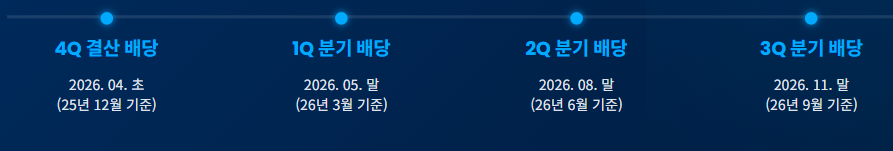 - 2026년 분기 배당: 각 분기 종료 후 약 1~2개월 내 지급