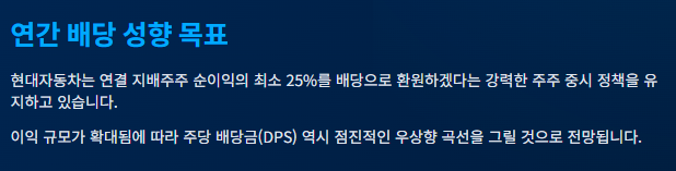 현대차는 연간 배당 성향을 연결 지배주주 순이익의 25% 이상으로 유지하겠다는 가이던스를 제시하고 있습니다. 실적이 개선됨에 따라 주당 배당금(DPS) 역시 점진적으로 상승하는 추세입니다.