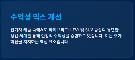 첫째, 하이브리드와 SUV 중심의 고수익 믹스 개선이 지속되고 있습니다. 전기차 캐즘(일시적 수요 정체) 상황에서도 현대차는 유연한 생산 체계를 통해 하이브리드 모델의 판매를 확대하며 안정적인 수익성을 증명하고 있습니다. 이는 주가의 하단을 지지하는 핵심 요소입니다.