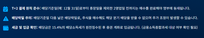 주식은 매수 후 실제 계좌에 입고되기까지 2거래일이 소요됩니다. 따라서 12월 31일이 배당기준일인 경우, 휴장일을 제외한 2영업일 전인 12월 26일까지는 매수를 완료했어야 배당 권리가 발생합니다. 만약 배당락일(기준일 다음 날)에 주식을 매수한다면 해당 회차의 배당금은 받을 수 없으므로 주의가 필요합니다.