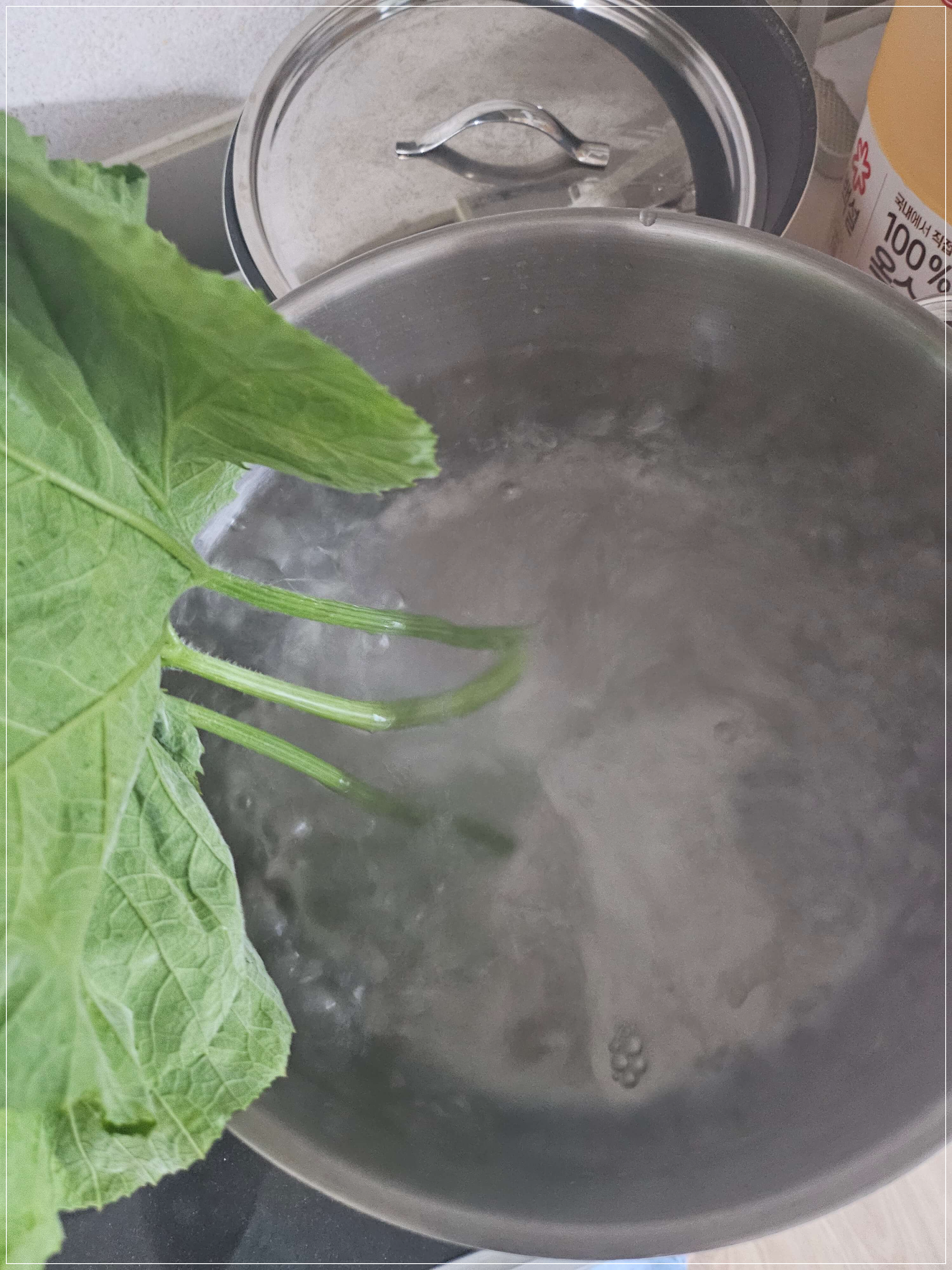 물이 끓으면 호박잎을 넣고 1분에서 2분 정도 삶습니다. 너무 오래 삶지 않게 주의해 주세요