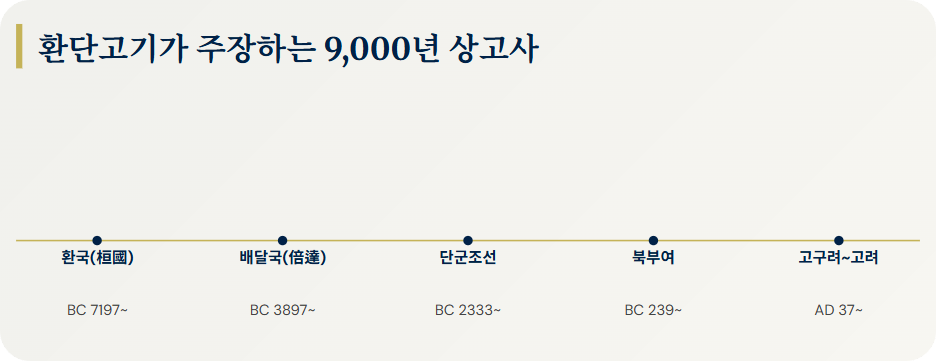 이 기록들에 따르면 우리 역사는 기원전 7197년 '환국'에서 시작되어 9,000년이 넘는 유구한 역사를 가진 것으로 묘사됩니다.