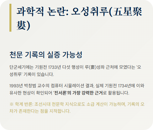 환단고기는 역사적 사실 여부를 떠나, 근현대 한국인들이 잃어버린 역사에 대해 어떤 열망과 자부심을 가졌는지를 보여주는 하나의 사회문화적 현상으로 이해되기도 합니다. 혹시 환단고기 내용 중 과학적 근거로 자주 언급되는 '오성취루(다섯 행성이 모이는 현상)' 기록의 구체적인 내막이 궁금하시다면 추가로 말씀해 주세요. 상세히 안내해 드리겠습니다.